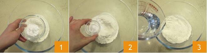 Para preparar os pizza muffins, primeiro cuide da massa: em uma tigela, coloque a farinha, o fermento instantâneo para preparações salgadas 1 e o sal 2, adicione a água aos poucos, misturando com as mãos 3.