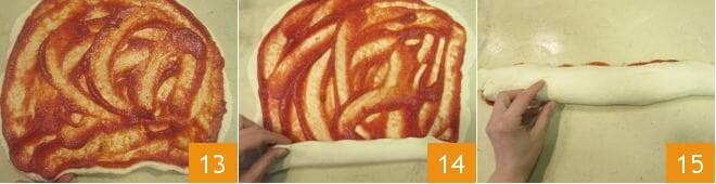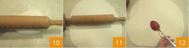 Retome a bola de massa, enfarinhe levemente a superfície de trabalho e abra com o rolo, dando à massa uma forma ligeiramente oval 10, até atingir uma espessura de cerca de 1 cm 11. Comece a distribuir o molho de tomate por toda a superfície da massa com uma colher 12, reservando cerca de duas colheres.
