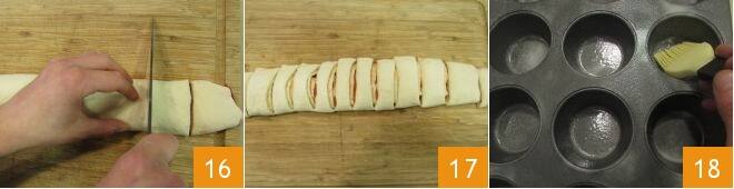 Transfira o rolo para uma tábua de corte e, com uma faca bem afiada, corte em 12 rolinhos (16-17). Unte uma forma de muffin para 12 unidades 18.