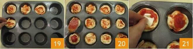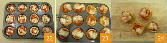Os pizza muffins estão prontos para assar 22: asse em forno estático pré-aquecido a 180°C por 20/25 minutos. Uma vez prontos, retire do forno, espere alguns instantes antes de desenformar e tempere com um pouco de orégano a gosto 23; saboreie os pizza muffins bem quentes 24.