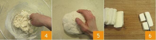 Continue amassando à mão 4 e, quando a água estiver absorvida, transfira a massa para uma superfície de trabalho e forme uma bola 5. Agora cuide do recheio: corte a mussarela em cubinhos 6;
