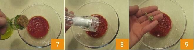 em uma tigela, coloque o molho de tomate e tempere com óleo 7, sal 8 e orégano 9, misture para dar sabor.
