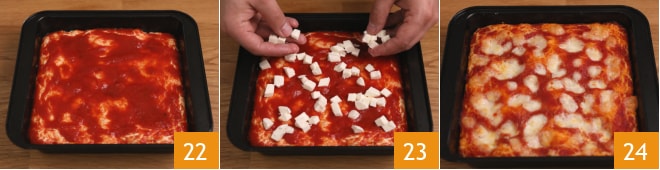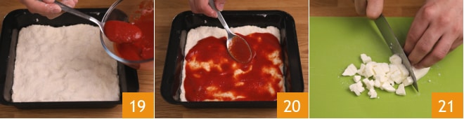 Adicione o tomate na superfície 19, distribuindo-o uniformemente com as costas de uma colher 20, depois deixe crescer em temperatura ambiente por mais 2 horas. Se o tempero estiver um pouco seco, cubra a assadeira com um pano. Enquanto isso, corte a mussarela em cubos 21.