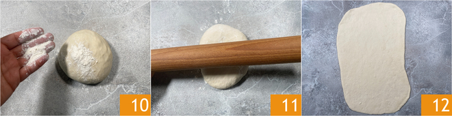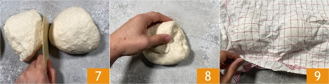 Divida a massa ao meio com uma espátula 7, forme bolinhas 8 e deixe descansar por 10 minutos, cobertas com um pano 9.