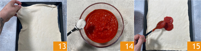 Transfira a massa para a assadeira bem untada com óleo e estique-a delicadamente para que cubra toda a superfície 13. Agora tempere o molho de tomate com sal 14 e misture bem. Espalhe o tomate sobre toda a superfície da massa 14, inclusive nas bordas.
