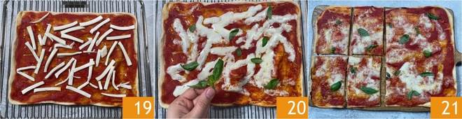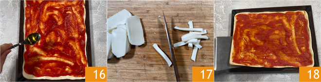 Regue com um fio de óleo 15 e asse a pizza em forno estático pré-aquecido a 250°C por 10 minutos, posicionando a assadeira em contato com a parte baixa do forno. Enquanto isso, corte a mussarela em tiras 17. Após 10 minutos, retire a assadeira e transfira a pizza 18 diretamente para a grade.