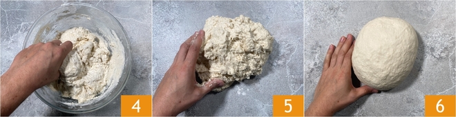 Uma vez que a mistura esteja homogênea, continue a trabalhar com as mãos, primeiro na tigela 4 e depois na bancada 5. Você deverá obter uma massa lisa e homogênea 6.