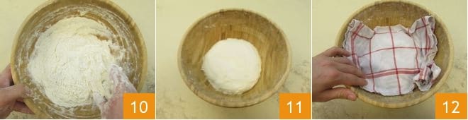 e continue amassando até que toda a farinha esteja incorporada: fazer a massa à mão permite ajustar melhor a consistência da massa e entender se é necessário adicionar um pouco mais de farinha. Neste ponto, continue trabalhando a massa dentro da madia, ou da tigela, por 10-15 minutos, até que fique lisa e homogênea 11. Deixe a massa crescer dentro da madia e cubra-a delicadamente com um pano limpo, ligeiramente umedecido 12. Deixe-a crescer em um local protegido de correntes de ar ou variações de temperatura quente-frio.