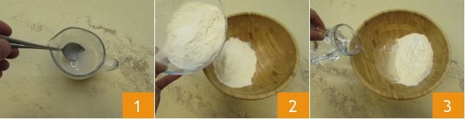 Para preparar as pizzelles fritas, comece a fazer a massa. Primeiro, despeje um pouco da quantidade de água indicada (em temperatura ambiente) em uma pequena jarra. Adicione o fermento biológico fresco esfarelado e misture com uma colher de chá até que se dissolva completamente 1. Deixe o fermento descansar e, enquanto isso, coloque cerca de 30% da farinha de um lado da madia 2. A madia é um recipiente de madeira, que suporta bem a temperatura da massa e evita que ela grude nas bordas. Se não tiver uma, você pode usar um recipiente de madeira ou uma tigela de vidro. Em seguida, despeje a água na outra metade da madia, evitando despejá-la diretamente sobre a farinha 3.