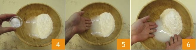 Adicione o sal à água 4 e dissolva-o mexendo delicadamente com as mãos 5. Assim que não sentir mais nenhum grão, comece a misturar a farinha 6.