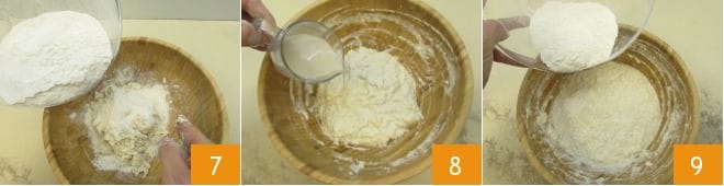 Despeje mais um pouco de farinha 7 e, aos poucos, com as mãos, faça um movimento rotatório para misturá-la à água. Quando tiver incorporado cerca de 50% da farinha, adicione à massa o fermento dissolvido anteriormente 8. Continue adicionando mais farinha 9.