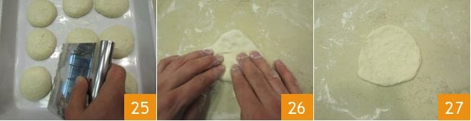 Após as 2 horas de fermentação das bolinhas, aqueça uma panela grande com óleo de sementes de amendoim para atingir a temperatura de no máximo 180°C (verifique com um termômetro de cozinha). Usando uma espátula, solte uma porção por vez da bandeja 25 e transfira-a para a superfície de trabalho levemente enfarinhada. Usando as pontas dos dedos, estenda sua primeira pizzella, alargando-a delicadamente (26-27).