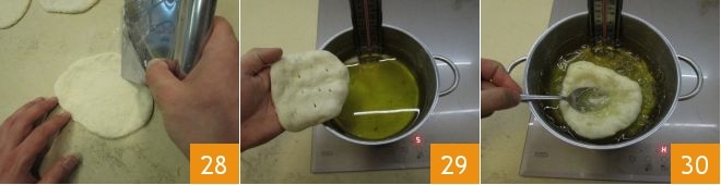 Em seguida, usando a ponta da espátula, faça pequenos furos na massa 28; assim, ela não se inflará muito durante o cozimento. Assim que o óleo atingir a temperatura indicada, mergulhe a pizzella 29, pressionando-a no centro com uma colher 30, para evitar que se infle excessivamente e criar uma cavidade central que, após a cocção da pizzella, armazenará o condimento.