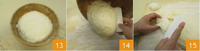 Deixe-a descansar por pelo menos 4 horas em temperatura ambiente, longe de correntes de ar. Após esse tempo, pegue a massa 13 e transfira-a, usando uma espátula, para uma superfície levemente enfarinhada 14. Ainda usando a espátula, divida-a em porções de 50 g cada 15. Com essas quantidades, você obterá cerca de 25 porções.
