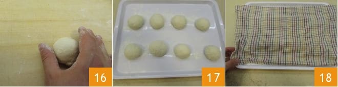 Com a ajuda de um pouco de farinha, dê a cada porção dobras para formar uma bolinha, colocando as extremidades por baixo 16 e, aos poucos, coloque-as em uma bandeja levemente enfarinhada (a parte das extremidades dobradas vai tocar a base) 17. Cubra com um pano seco desta vez 18 e deixe descansar por pelo menos mais 2 horas, sempre em um local longe de correntes de ar.
