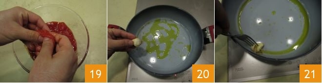 Enquanto isso, prepare o molho; transfira os tomates San Marzano para uma tigela de vidro e desfie-os com as mãos 19; como alternativa, você pode usar um garfo. Em seguida, despeje um fio de óleo em uma panela, adicione um dente de alho com casca previamente esmagado 20 e deixe fritar até dourar; depois, retire-o 21.