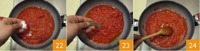 Adicione o tomate à panela e ajuste o sal 22; em seguida, adicione também o orégano 23 e deixe cozinhar em fogo baixo por pelo menos meia hora, mexendo frequentemente, até que o molho fique espesso 24.