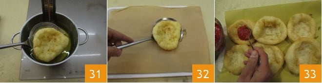Quando estiver bem dourada, escorra a pizzella com uma escumadeira 31 e coloque-a sobre um papel para frituras 32. Continue assim a cozinhar as outras. Assim que estiverem cozidas, você poderá temperá-las: despeje uma colher de molho de tomate na cavidade de cada pizzella 33