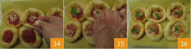 depois um pouco de queijo ralado 34. Finalize com as folhinhas de manjericão fresco 35 e sirva suas pizzelles ainda quentes 36!