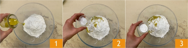Para preparar as pizzettes sem glúten, comece pela massa: coloque em uma tigela o mix de farinhas e o azeite de oliva extravirgem 1, depois adicione o sal 2 e o fermento instantâneo 3.