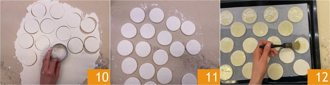 Com um cortador redondo de 7 cm, corte vários discos 10 e disponha-os ordenadamente sobre a bancada 11. As sobras da massa podem ser reamassadas, você obterá cerca de 40 pizzettes. Transfira os discos para uma assadeira forrada com papel manteiga, bem espaçados, e pincele a superfície com azeite de oliva extravirgem 12.