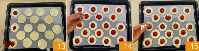 Tempere as pizzettes com uma colher de chá de molho de tomate no centro 13, adicione uma pitada de orégano 14 e alguns cubinhos de mozzarella 15.