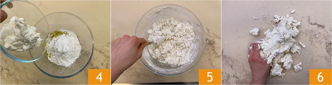 Por fim, incorpore o iogurte grego 4. Misture com um garfo para integrar os ingredientes 5, em seguida transfira a massa para a bancada e comece a trabalhá-la com as mãos 6.