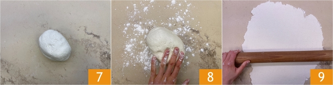 Você deve obter uma massa lisa e firme 7. A massa está pronta e pode ser trabalhada imediatamente, não precisa descansar. Polvilhe levemente a bancada com um pouco de farinha sem glúten 8 e abra a massa com o rolo até obter uma folha uniforme de aproximadamente 4 mm de espessura 9.