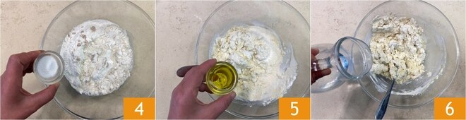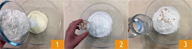 Para preparar o pizzolo siciliano, despeje em uma tigela as duas farinhas 1, o fermento esfarelado 2 e parte da água 3.