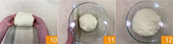 Trabalhe a massa fazendo dobras de reforço slap and fold 10, levantando a massa para depois deixá-la cair sobre a superfície, dobrando-a sobre si mesma. Coloque a massa em uma tigela, cubra com filme plástico 11 e deixe crescer por duas horas a 25°-26°. Após o tempo de descanso, a massa terá dobrado de volume 12.