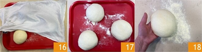 Cubra com um pano e deixe crescer uma segunda vez por 30 minutos 16. As porções estão prontas 17, transfira-as novamente para a superfície enfarinhada 18.