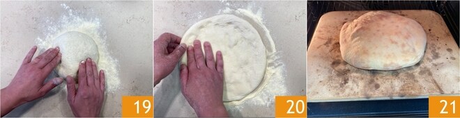 Pressione no centro para alargar a massa 19, e estenda-a como se faz com a massa de pizza 20, obtendo um diâmetro de cerca de 20-22 cm. Enfarinhe dos dois lados e transfira o pizzolo para a pedra refratária aquecida no forno a 240° e asse por 7-8 minutos 21.