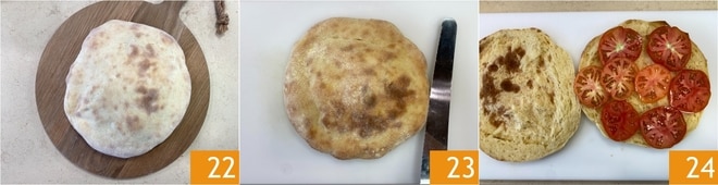 Retire o pizzolo do forno 22, deixe esfriar um pouco, depois divida-o ao meio 23 e recheie com algumas fatias de tomate 24.