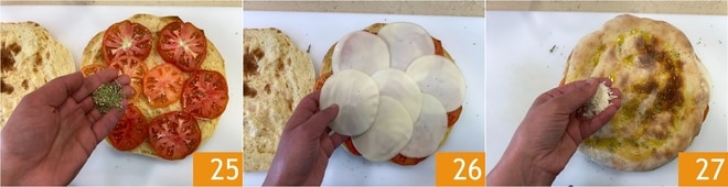 Salgue e tempere com óleo e orégano 25. Cubra com fatias de provola 26, feche e polvilhe novamente com o Parmesão 27.