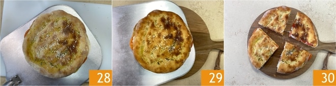 Um fio de óleo e mais orégano 28. Coloque novamente no forno, sempre sobre a pedra refratária, por 5 minutos a 240°. Retire do forno 29 e sirva quente o pizzolo siciliano 30.