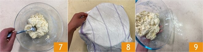 Depois de absorver a água 7, deixe a massa descansar coberta com um pano por 15 minutos 8. Despeje a massa sobre uma superfície ligeiramente enfarinhada com a sêmola 9.