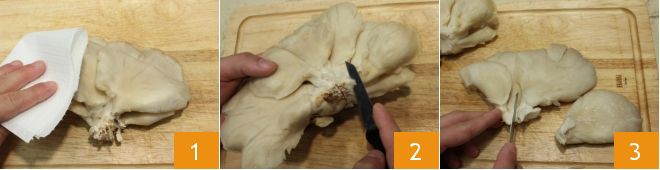 Para preparar os pleurotus grelhados, comece limpando os cogumelos: com um pano de cozinha limpe a superfície dos chapéus e o caule para remover a terra 1, depois com uma faca separe os caules do cacho (2-3) e, se necessário, passe o pano novamente nos chapéus e nas lamelas internas para eliminar eventuais traços de terra. Reserve os chapéus inteiros para o cozimento.