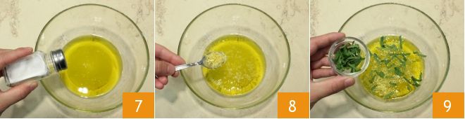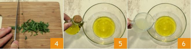 Agora prepare a emulsão para temperar os pleurotus grelhados: pique finamente as folhas de hortelã 4, depois despeje em uma tigela o azeite de oliva 5, o suco de limão 6,