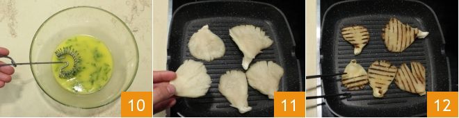 Misture com um batedor para incorporar a emulsão e reserve 10. Dedique-se agora ao cozimento na grelha dos cogumelos pleurotus: coloque no fogo uma grelha de ferro fundido e deixe-a aquecer, quando estiver bem quente distribua os cogumelos na grelha 11, deixe cozinhar por alguns minutos de ambos os lados 12 até ficarem bem cozidos.