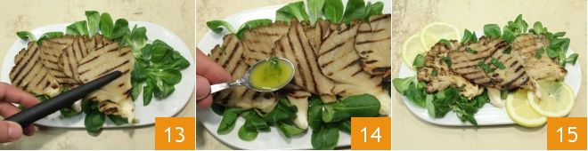 Quando o cozimento estiver completo, retire os cogumelos do fogo com a ajuda de uma pinça de cozinha e coloque-os em um prato de servir 13. Tempere os pleurotus com a emulsão de óleo e limão previamente preparada 14 e sirva imediatamente à mesa seus pleurotus grelhados bem quentes, decorando o prato a gosto com alface e fatias de limão 15.