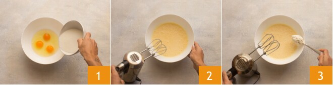 Para preparar o bolo de avelãs e gengibre, primeiramente coloque os ovos em uma tigela. Adicione o açúcar 1 e bata com a batedeira elétrica por cerca de 5 minutos 2. Continuando a misturar, adicione algumas colheres de farinha 3,