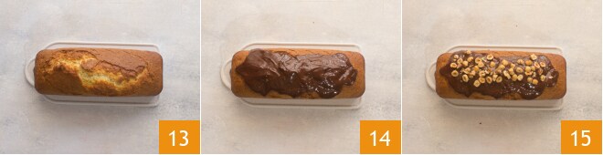Desenforme o bolo de avelãs e gengibre 13, despeje o chocolate na superfície e com a espátula espalhe quase por todo o bolo 14. Decore com as avelãs 15 e deixe endurecer antes de servir.