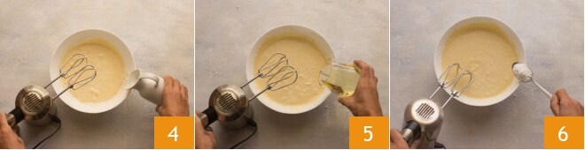 um pouco de leite 4 e continue assim alternando leite e farinha. Sempre com a batedeira ligada, adicione também o óleo em fio 5 e acrescente o fermento em pó para bolos 6.