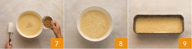 Adicione o gengibre em pó, a granola de avelãs 7 e misture com uma espátula 8. Despeje a massa preparada em uma forma de bolo de 30x12 cm, previamente untada 9. Asse o bolo a 180° por 40 minutos na prateleira mais baixa.