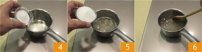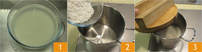 Enquanto isso, prepare a mistura de vinagre de arroz, que dará um sabor ligeiramente ácido ao arroz. Em uma panela pequena, coloque o vinagre e o sal 4. Aqueça em fogo médio-baixo para dissolver o sal, depois adicione o açúcar 5. Misture e desligue o fogo 6. Deixe esfriar.