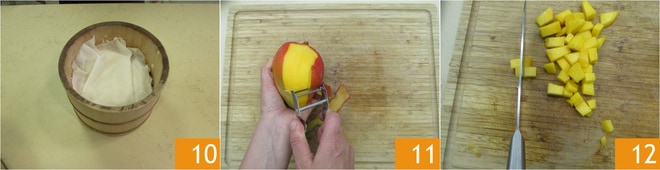 Espere que esfrie, mexendo delicadamente de vez em quando e depois cubra com um pano úmido para não grudar 10. Enquanto isso, cuide do restante: descasque a manga 11, corte-a em fatias e faça cubos de cerca de 2 cm com a polpa 12. Corte a cebolinha em rodelas, removendo a parte verde.