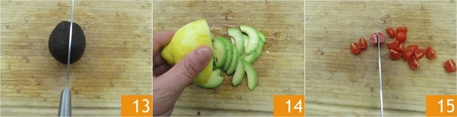 Passe para o abacate: corte-o ao meio 13, descasque e corte em fatias. Você pode regá-lo com suco de limão para não escurecer 14. Corte os tomates-cereja em 4 partes 15.