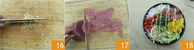 Prepare a maionese com uma colher de molho sriracha. Triture grosseiramente os amendoins 16. Corte o atum em fatias finas, como se fosse sashimi 17, ou, se preferir, em cubos. Agora você pode montar o poke de atum: nas tigelas, coloque o arroz na base, umedecendo as mãos antes. Adicione os legumes, frutas, algas e atum criando montinhos bem separados. Complete com os brotos, algas e o molho. Decore com sementes de gergelim, amendoins triturados, molho de soja e sirva 18.