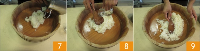 Quando o arroz estiver pronto, você pode colocá-lo em um recipiente grande de madeira (ou em outro material que não seja aço). Se usar um recipiente de madeira, recomendamos molhá-lo primeiro com água, depois esvaziá-lo: assim a madeira não absorverá o vinagre. Despeje o arroz no recipiente 7 e adicione a mistura de vinagre, deixando-a escorrer sobre a espátula de madeira 8, para espalhá-la de forma mais delicada e uniforme sobre o arroz. Misture o arroz mexendo com a espátula de madeira inclinada, para não esmagá-lo 9. É importante misturar até que os grãos estejam brilhantes e bem temperados.