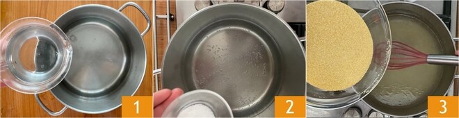 Para preparar a polenta ao forno, primeiro encha uma panela com água 1 e leve para ferver, depois adicione o sal 2 e o óleo. Despeje a farinha de milho em forma de chuva 3 e mexa continuamente com um batedor para evitar a formação de grumos. Quando a água voltar a ferver, abaixe o fogo e cozinhe por cerca de 50 minutos, mexendo sempre que possível.